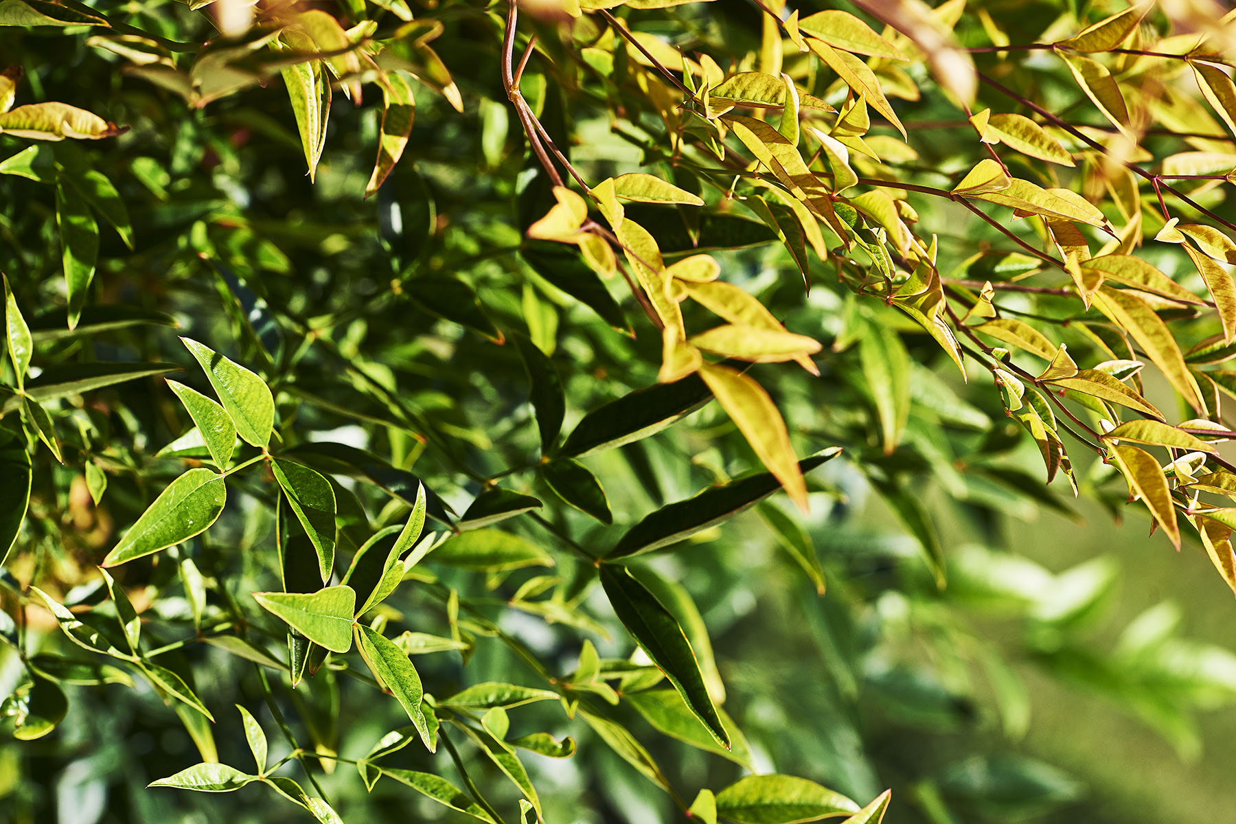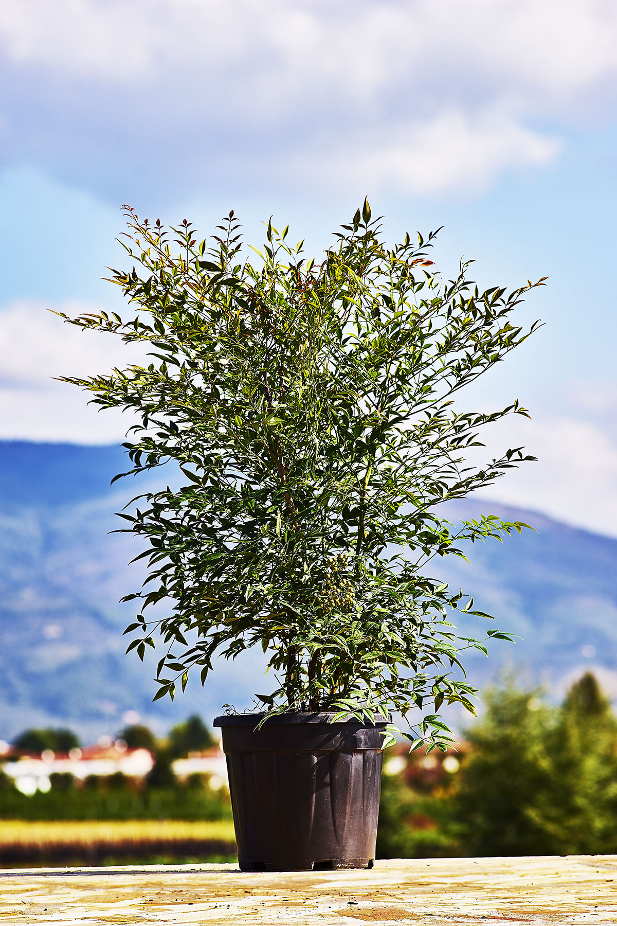 Arbusto a steli eretti, simili al Bambù. Foglie sempreverdi pennate,inizialmente sono rosa chiaro, diventano verdi in estate e sono rosse scure in autunno. Fiorisce in estate con racemi grandi di fiori bianchi, fruttifica tra fine inverno e inizio primavera con frutti rossi accesi raccolti in grappoli. Viene usata per macchie, siepi, viene coltivata anche in vaso e in fioriere. Foglie: Variano secondo la stagione Clima: Temperato Temperatura Minima: -20 °C