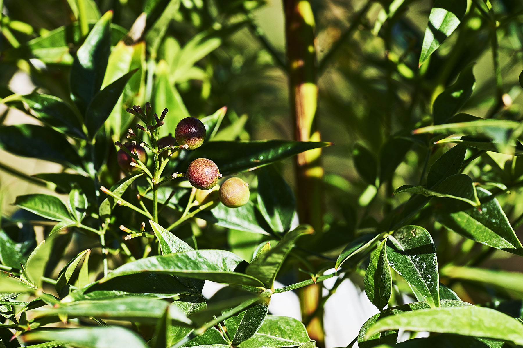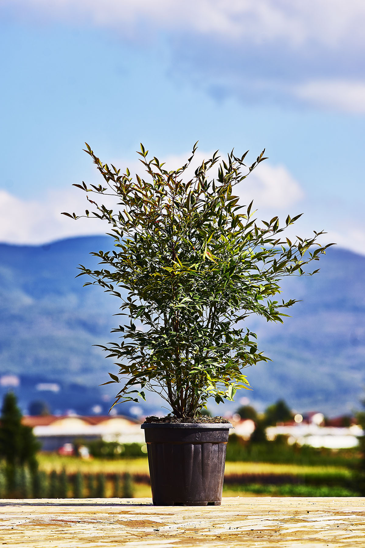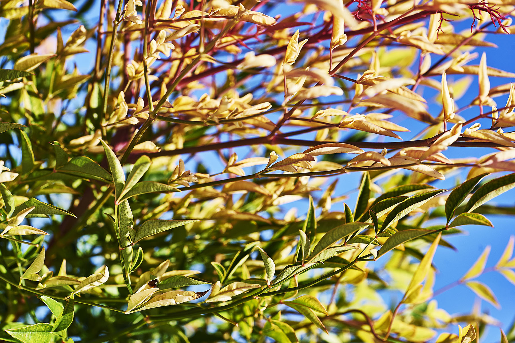 Arbusto a steli eretti, simili al Bambù. Foglie sempreverdi pennate,inizialmente sono rosa chiaro, diventano verdi in estate e sono rosse scure in autunno. Fiorisce in estate con racemi grandi di fiori bianchi, fruttifica tra fine inverno e inizio primavera con frutti rossi accesi raccolti in grappoli. Viene usata per macchie, siepi, viene coltivata anche in vaso e in fioriere. Foglie: Variano secondo la stagione Clima: Temperato Temperatura Minima: -20 °C