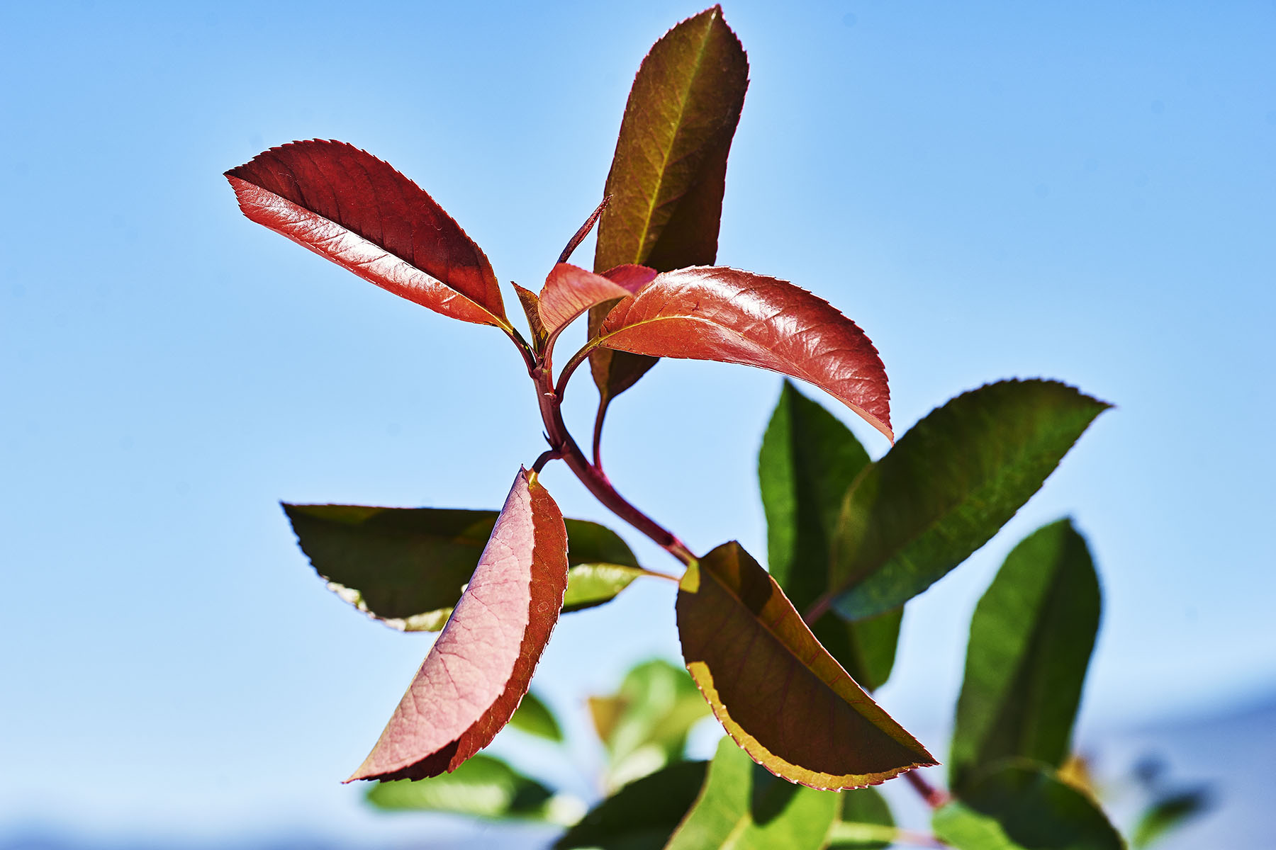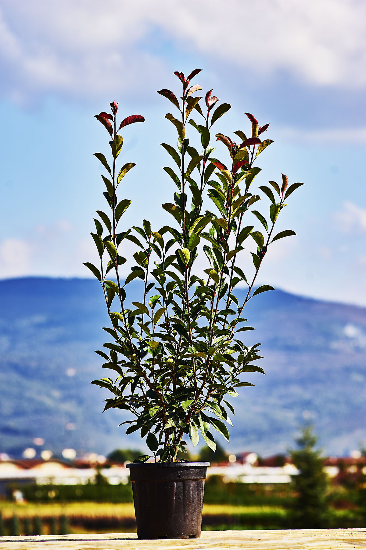 Arbusto dalla chioma eretta e folta, che può essere educata anche ad albero di piccole dimensioni. Foglie sempreverdi, rigide, ovali, di colore rosso all'inizio poi con la crescita verde al centro e rosso sui bordi. Fiorisce a maggio con fiori piccoli e bianchi, con sfumature rosa, raccolti in infiorescenze molto larghe. Fruttifica da fine estate a fine autunno con frutticini rotondi, di mezzo centimetro, inizialmente rossi e poi neri. Cresce in tutti i terreni ma preferisce quelli umidi, freschi e non compatti. Ideale per siepi compatte, sopporta bene le potature. Foglie: Verde al centro rosso ai bordi Clima: Temperato Temperatura Minima: -15 °C